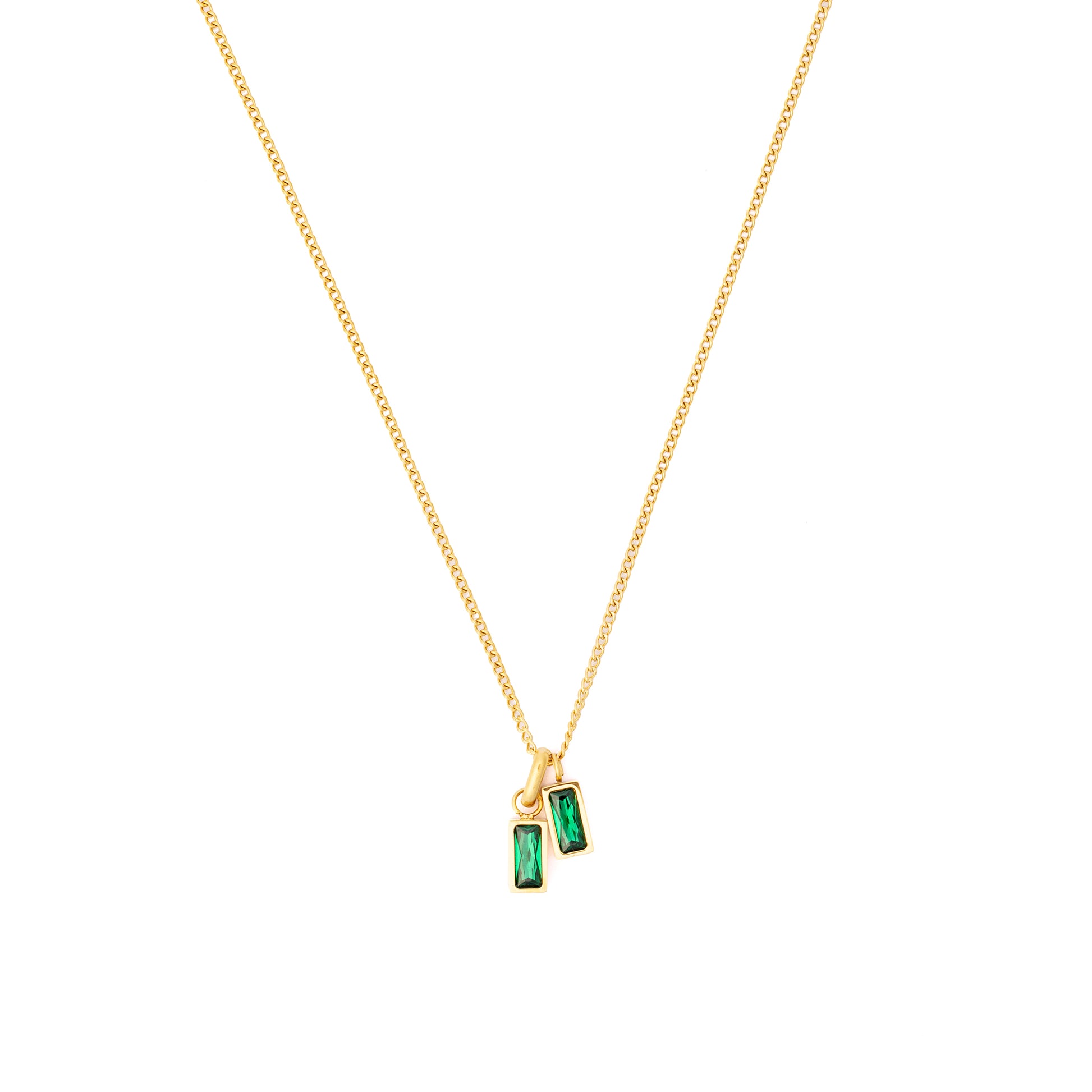 The Kleo necklace is crafted from Premium stainless steel, plated in 18k gold with a PVD coating for added durability. The striking green faceted stones add a touch of elegance, making it the perfect accessory for any occasion